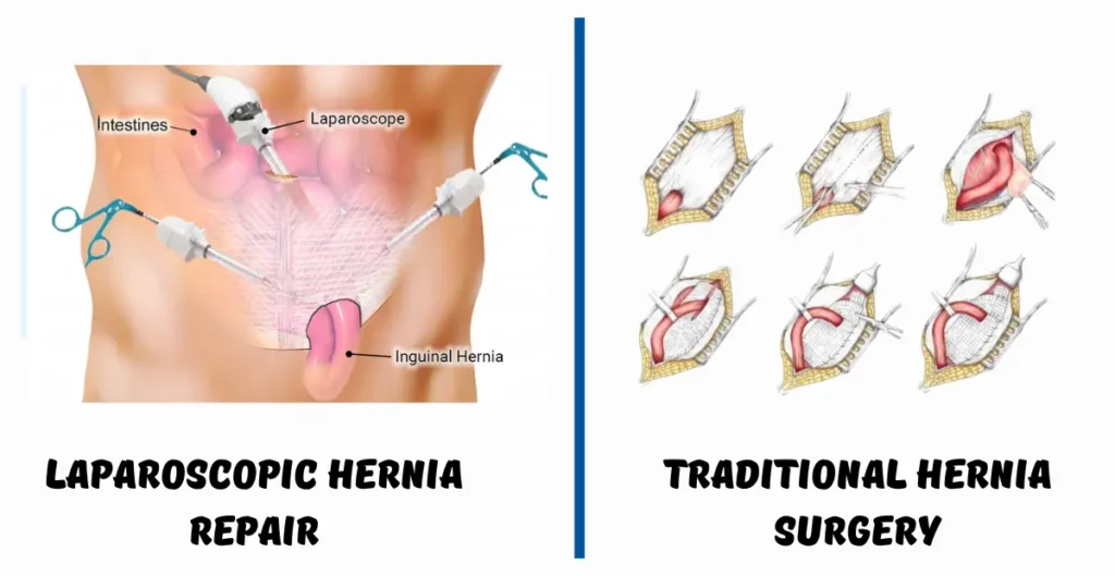 Laparoscopic hernia repair offers minimally invasive benefits, such as shorter recovery times and less postoperative pain. On the other hand, traditional surgery might be preferable for certain cases or patients who have specific health considerations.